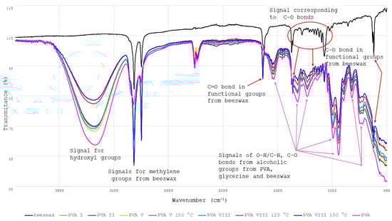 Figure 11 illustrates the FTIR spectra of the BW-PVA composite films. The signals from 3293 cm−1 correspond to the vibration of OH groups [46] and are present in all PVA based films but not in the FTIR spectrum of the BW, as a result of its hydrophobic property. A weaker signal from the BW-containing films indicates a weakening of the hydrogen bonds of the PVA film due to better matrix conjugation through the presence of BW. The signals from 2915 and 2847 cm−1 are assigned to the vibration of methylene groups and are stronger in BW FTIR spectrum than in those of the PVA-based films [46]. The peak at 1736 cm−1 is assigned by the vibration of C=O bonds in functional groups from beeswax and appears in the FTIR spectrum of the BW and in those of the PVA-BW films and is absent in the FTIR spectrum of PVA and PVA I [47]. The signals at 1646 cm−1, 1423 cm−1, 1329 cm−1, 1094 cm−1, 1042 cm−1, 922 cm−1, and 825 cm−1 appears in the FTIR spectra of PVA and PVA based films and are assigned due to the vibration of C-O/C-H and C-O bonds from alcoholic groups [46]. The peaks in the region 1473–1175 cm−1 appear in the spectra of BW and of PVA modified with BW. This demonstrates the chemical modification of the PVA-BW structures. By comparing the FTIR spectra of PVA VIII, PVA VIII 125 °C, and PVA VIII 150 °C, common peaks can be observed at 1735 cm−1 assigned by the vibration of C=O bonds, in the region of 1416–1174 cm−1 and at 719 cm−1 due to the vibration of the C-O bond in carboxyl groups from free fatty acids [47]. The difference between the FTIR spectra of these samples consists in a weaker signal in the heat treated samples, which is explained by a more intense cross-linking of the network, resulting in a more compacted structure [48].
