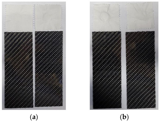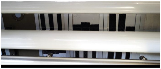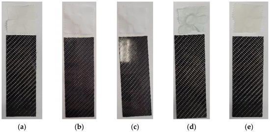 Deviation from the standard: the lower temperature of the black tile is due to the thermal strength of the cured product (without annealing), which, according to the technical data sheet of the epoxy system used in the samples, is between −10 and 50 °C. Therefore, the temperature of the black plate was reduced so as not to tighten up the test too much. The test was performed on an Atlas UV Tester (Klimatest, Wroclaw, Poland), which is a UV fluorescence test instrument that allows simultaneous condensation of the samples under selected atmospheric conditions. The appearance of the specimens during the test is shown in