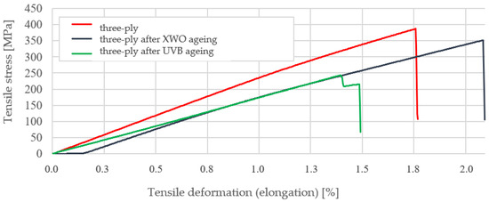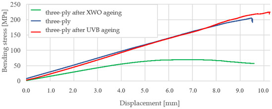 Ageing tests, determining the material’s resistance to six months of use in a temperate environment, showed that the strength properties increase under exposure to sunlight. For example, the average bending stress increased by about 23% and the average tensile stress by about 4%. UVB radiation, on the other hand, causes a strong degradation of the matrix and a significant reduction in the strength properties of the composite (average bending stress decreased by about 69% and average tensile stress decreased by about 29% relative to unaged samples).