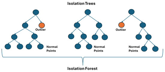 The path of every sample from the root node is denoted as and the average value of the paths from the forest as . By using BST [14], the non-successful search length is computed, which is denoted as . An illustration of the Isolation Forest is shown in Figure 2. Outliers are defined based on shorter paths from the root node of the created Isolation Trees.