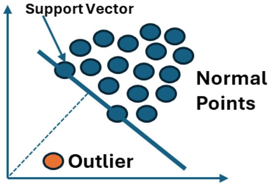 In Equation (12), the parameter is used in the second term to adjust the slack variables’ effect on the quadratic problem. The parameter controls the trade-off between the number of outliers and the margin from the origin. If , then the boundaries of the hyperplane are loose, and then it separates all data from the origin. If , then the boundaries of the hyperplane become tighter, and it separates less data from the origin. An illustration of One Class SVM is shown in Figure 3.