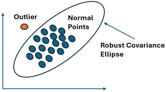 where is the mean, S is the covariance matrix of the samples, and T is the annotation of the transpose operation. The calculated distance of every data point can be used to define a region of normal data and outliers. In the calculation of mean and covariance, outliers can affect the calculated values, thus leading to the identification of outliers as normal data, an effect also known as the ‘Masking Effect’ [16]. To enhance robustness against this effect, Minimum Covariance Determinant (MCD) is used to estimate the mean and the covariance matrix. The MCD computes the mean and the covariance matrix for h observations, where and can be calculated as . FAST-MCD [19] is employed for MCD implementation due to computation speed and efficiency. After the estimation of robust mean and covariance, the Mahalanobis distance for every sample is calculated. An illustration of the computed Robust Covariance Ellipse is shown in Figure 4.