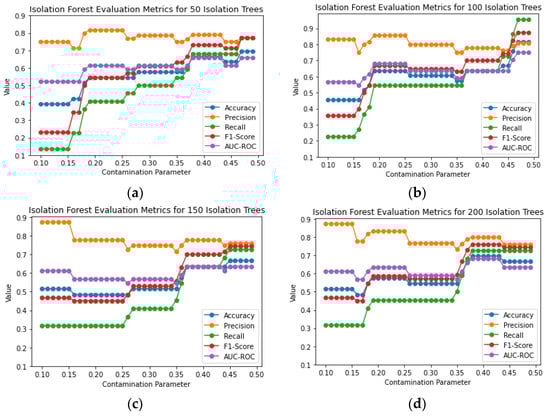 Isolation Forest evaluation metrics for 50 (a), 100 (b), 150 (c), 200 (d) Isolation Trees and contamination parameter in the range of 0.1–0.5.