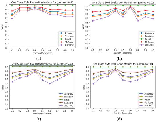 One Class SVM evaluation metrics for gamma equal to 0.01 (a), 0.02 (b), 0.03 (c), 0.04 (d) and fraction parameter in the range 0.1–0.9.