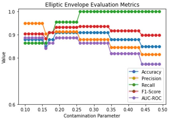 Lastly, Robust Covariance Elliptic Envelope was assessed for the same dataset. The influence of different contamination parameters is shown in Figure 15. We can observe that the best values of the evaluation metrics arise for a contamination parameter equal to 0.2 or 0.3. The evaluation metrics for the above parameters are shown in Table 6. The main difference lies in the decrease in precision and ROC AUC and the increase in Recall and F1-score for contamination parameter equal to 0.2 and 0.3, respectively.