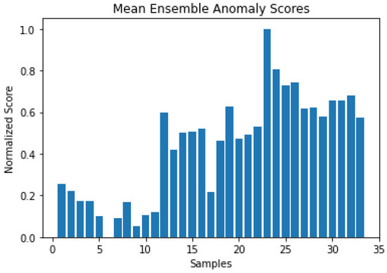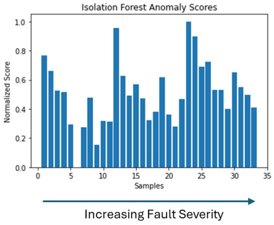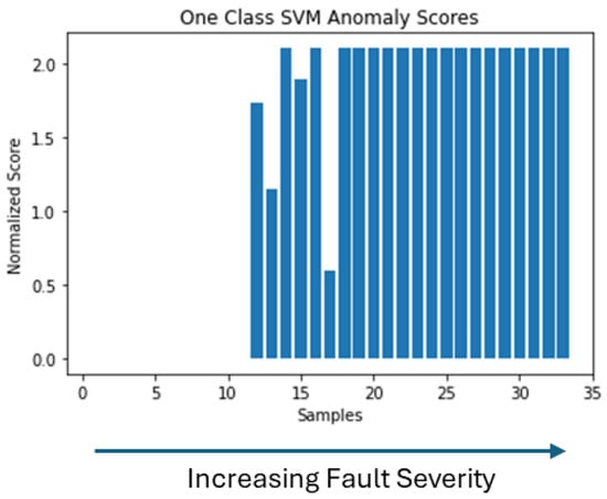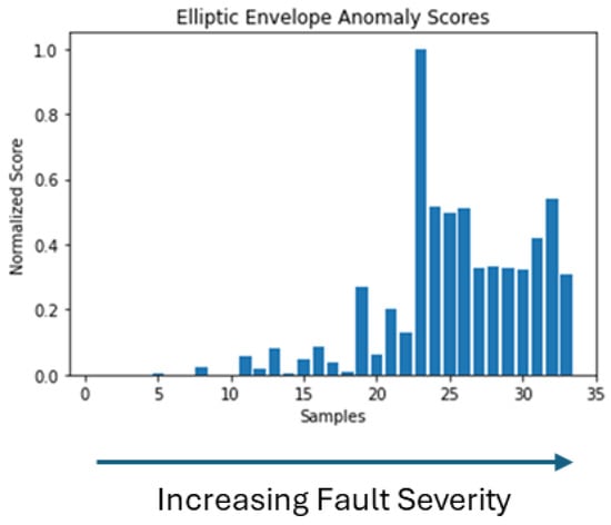 To estimate the severity of the fault, the anomaly scores generated by each model are employed. Based on how anomaly scores are generated, each of the above methods generates a different range of values. For this reason, the values are normalized. Higher anomaly scores indicate faulty operating conditions in the PMSM. In the test dataset, the first 11 samples respond to a healthy working state, while the following 11 respond to a faulty state with a low fault severity, and then the last 11 respond to an increased fault severity. In the case of the One Class SVM, in Figure 16, we can see that healthy samples are distinguished from faulty samples, and especially the latest samples of increased severity. However, the difference between each sample for the latest samples and the increased severity is not clear. In the case of the Isolation Forest, in Figure 17, we see that we have increased anomaly scores for faulty cases that can be used as indicators of fault occurrence and increase in severity. In the case of the Elliptic Envelope, in Figure 18, we have the clearest picture, as we observe that anomaly scores are low for healthy samples while increasing with the appearance of the fault and especially at higher severity.