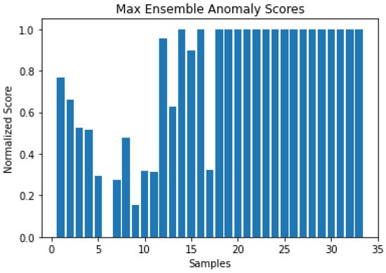 Ensemble techniques can be employed to utilize the scores generated from the models and improve severity estimation. For each sample of the three models, the average values are calculated. This results in the mean anomaly scores, shown in Figure 19. The evaluation metrics extracted in the previous section can be used to introduce weights to each anomaly score produced by each model, respectively. However, in this case, there was no notable change from the mean ensemble, so it was not examined further. Other than Mean Ensemble, Max Ensemble can be employed, where the max values from each model are used. The corresponding anomaly scores are shown in Figure 20.