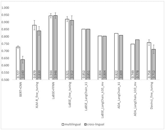 While a direct comparison of our results with other research works is challenging due to differing experimental conditions, some of our findings are consistent with those identified by previous researchers. These findings highlight the superiority of sophisticated transformer-based approaches. For instance, multilingual (and crosslingual) models such as XLM-R or LaBSE have demonstrated superior performance compared to multilingual BERT, as discussed in [18]; the superiority of XLM-R is also affirmed in [19]. Although LaBSE is not usually the best option in other studies, it excels in our context primarily because of the limited number of languages tested. LaBSE, serving as the crosslingual model fine-tuned on bilingual English–other language sentences (as shown in Figure 7 in [34]), supports 109 languages—more than are included in our dataset. Moreover, LaBSE benefits from the sheer volume of these bilingual sentences and sentences in related languages within groups such as Germanic, Romanic, Slavic, etc. There is always a risk that languages not covered by the list of 109 languages may not be well recognized. However, their similarity to other supported languages can still provide some benefits.