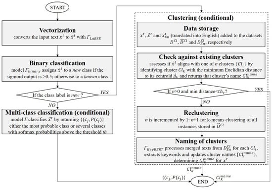 The previously trained multi-class classification model, denoted as , and the binary text classification model, , are integrated into the final system. The final system is depicted in Figure 2, which is composed of multiple blocks detailed in the sections below (for notation details, see Section 3):