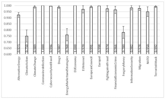 Zooming into the results for different topics (see Figure 4) reveals that the worst performance is observed in the ClimateAction, EnergyMarketsandStrategies, and ForgeryMoney topics. This outcome is unsurprising given our training dataset’s limited coverage of these topics. Manual error analysis revealed that ClimateAction is frequently confused with a similar ClimateChange topic. Additionally, the accuracy of the best-covered NATO topic reaches approximately 95%, indicating that augmenting training data for less-covered topics would likely enhance prediction accuracy.