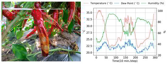 We used the dataset from Korea AI Challenge, the ‘Crop Disease Diagnosis based on Agricultural Environmental Changes’. The data collection for the challenge was conducted by LG AI Research, and the challenge was hosted by Dacon Inc. (Seoul, Republic of Korea). The data can be downloaded from the Dacon website [26]. The dataset containing labels consists of 4675 samples. The provided samples consist of image data and environmental data from the same crop. The infected leaves, vegetables, or fruits with diseases are placed in the center of the image. The environmental data include the information of temperature, humidity, and dew point recorded at 10 min intervals for at least 48 h before capturing the crop disease images. The environmental data are provided in the form of comma-separated value files. One of the examples of the given crop image and environmental data is shown in Figure 1.