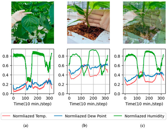 Figure 3 shows an example of a proposed mixup augmentation for multimodal data. The top images represent crop images, while the bottom graphs represent environmental data normalized with min-max normalization. Figure 3a represents Paprika-Deficiency (P)-Early, (b) shows Paprika-Normal, and (c) illustrates the results of mixup augmentation. The multimodal data from (a) and (b) were linearly interpolated with a weight of 0.5 each, resulting in synthesized data (c). The synthesized data have labels of 0.5 × ‘Paprika-Deficiency (P)-Early’ and 0.5 × ‘Paprika-Normal’.
