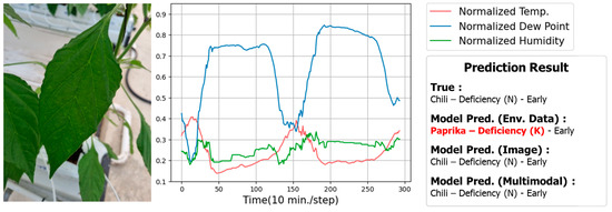 In Section 1, we assumed that image data and environmental data play a complementary role in predicting crop disease diagnosis. Here, we will confirm this assumption through two case studies of crop disease prediction results based on different data modalities. Figure 4 shows an image of a paprika leaf infected with intermediate-stage powdery mildew along with the associated environmental data. When only environmental data were used, the model accurately predicted the crop type and disease. However, when only images were used, the model correctly identified the crop type but incorrectly classified it as healthy. In fact, since the disease was in its early stage, the powdery mildew spores were barely visible in the images. When both image and environmental data were used, the model correctly identified both the crop type and the disease.