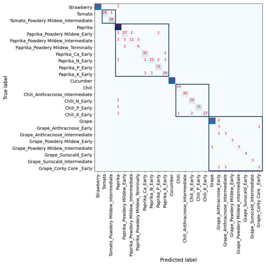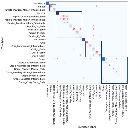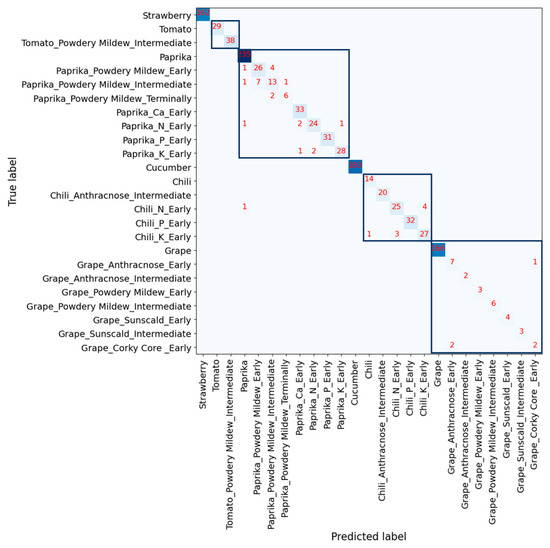 In Figure 6 and Figure 7, the confusion matrix illustrates the predictions of a deep learning model trained with different data modality. In the confusion matrix, a square box drawn with bold blue lines means that the labels in the box belong to the same crops but have normal status or different disease severity. For example, in the box located at the top left corner, there are two labels for normal and powdery mildew with intermediate severity for tomato. The intensity of the box color represents the number of data. The darker blue, the more data it represents, and the lighter one, the fewer data it represents.