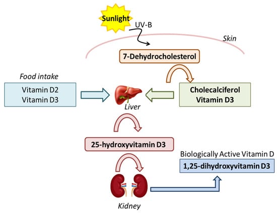 The main production site of Vitamin D is the skin [6]. Vitamin D3 (cholecalciferol) is produced in the skin when exposed to UVB rays with a wavelength of 290–315 nm. These radiations convert 7-dehydrocholesterol (7-DHC) into pre-Vitamin D, which in turn is converted into Vitamin D3 in a thermosensitive but non-catalytic process, which involves the formation of three double bonds [11]. Both UVB intensity and skin pigment levels influence the rate of D3 formation. Vitamin D skin production will therefore be influenced by different factors such as latitude, seasonality, clothing, pollution and the use of UV filters [12,13]. In summer, 15 min of full-body sunlight at midday is equivalent to 250 μg of cholecalciferol [14]. However, many factors influence the effectiveness of this combination (Figure 1).