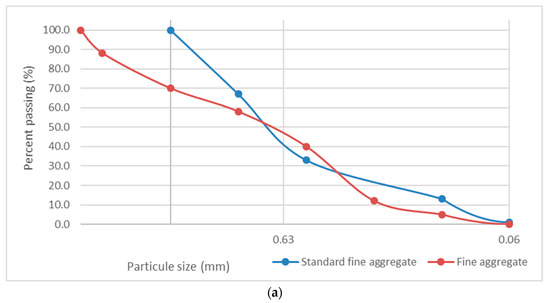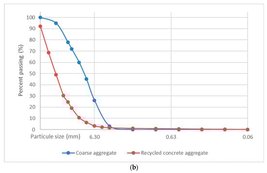 Particle size distribution. (a) comparison of the particle size distribution of the standard fine aggregate and the fine aggregate used. (b) comparison of particle size distribution of natural coarse aggregate and recycled concrete aggregate.