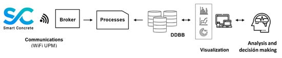 The data was transmitted by Wi-Fi connection to our IoT platform, known as Tellus IoT (V 2.1), which allows storage to take place in the cloud as well as real-time visualization of the data generated by the project (Figure 2). This IoT infrastructure enables the effective management of real-time data to optimize processes, making it the digital core for informed and up-to-date decision-making [36].