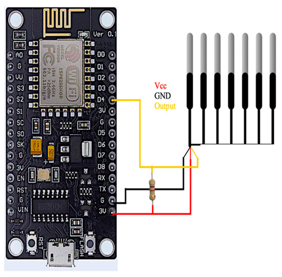 For temperature monitoring, the DS18B20 sensor (Zhiwei Robotics Corp. from Shanghai, China), was used, due to its versatility, simple programming, low cost, and resistance to humid environments. It is a digital Celsius thermometer that provides 9 to 12 bits, with 64-bit memory (equivalent to 8 bytes) to store the unique identifier or address of every sensor and a non-volatile top alarm function programmable by the user. It is compatible with Arduino and has three pins: Vcc, GND, and DQ, which in this case corresponds to the data pin. The sensor can be encapsulated, i.e., sealed in a watertight wrapper, and there is also waterproof probe. The DS18B20 sensors support 3 to 5.5 V power and 9-bit, 10-bit, 11-bit, and 12-bit resolutions (12-bit resolution is the default). The range of temperature values it can measure are from −55 °C to 125 °C, with an accuracy of ±0.5 °C from −10 °C to +85 °C; outside this range, the variation could be greater.