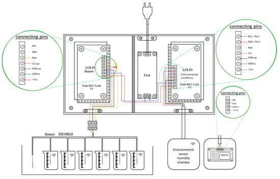 Two separate tests were carried out in order to be able to adjust the parameters as necessary. In the first trial, two Node MCU Lolin v3 microcontrollers and a power supply were set up. The environmental microcontroller was physically connected via a cable to the BME280 sensor inside the wet chamber. The other microcontroller was connected to the different DS18B20 sensors via the electrical terminals. The seven sensors inside the wet chamber measured the temperature of the specimen mixture during the setting time and the temperature of the water. The connection diagram and the final schematic of the first prototype are shown in Figure 3 and Figure 4.