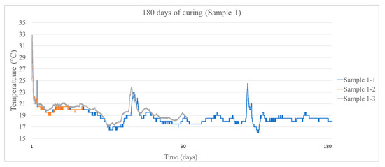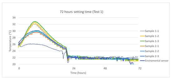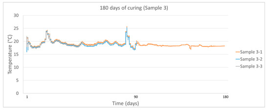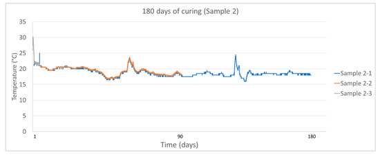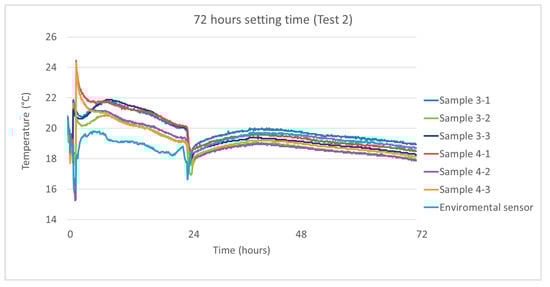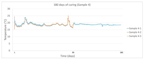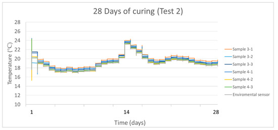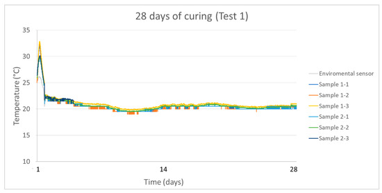 It can be observed that, unlike the first hours of setting, the temperature sensors of the different samples showed identical behavior to that of the ambient temperature sensor during curing up to 28 days.