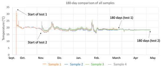 Figure 10, Figure 11, Figure 12 and Figure 13 show the results obtained during 180 days of temperature monitoring.