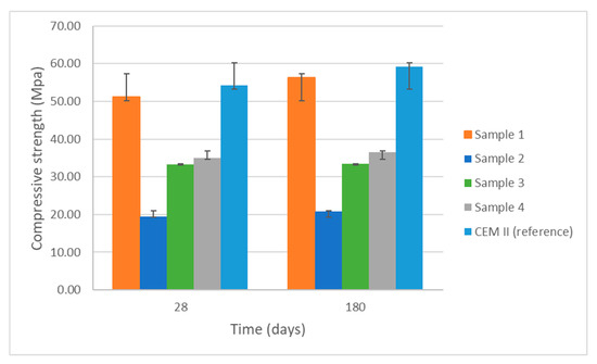 In Figure 15, a large variation can be observed between the compressive strengths of the different materials, with the reference samples (sample 1 and CEMII) being the ones with the highest strength.
