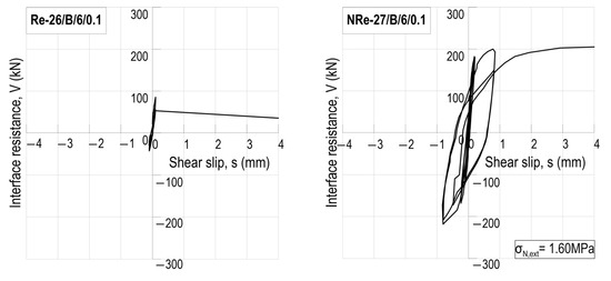 The ratio V/s for the first cycle, corresponding to the shear stiffness of the specimens, is shown in Figure 7 to clearly demonstrate the significantly higher stiffnesses of the interfaces under external compression compared to those without normal stress. Furthermore, it is also observed that while, in the absence of external compression, the stiffness seems to depend on the reinforcement parameters (ratio, diameter of bars, and embedment length), in the presence of σN,ext, those parameters do not affect the interface stiffness.