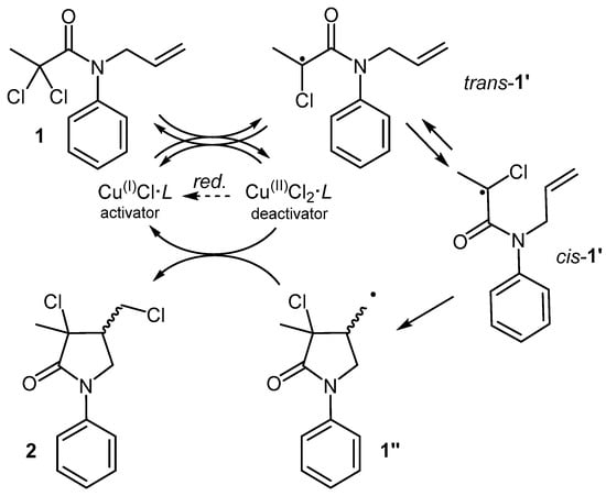A classic example is the transition metal-catalyzed ATRC of N-allyl-2,2-dichloroamides, which enables access to functionalized specialty chemicals [3]. The process starts with the reversible interaction between the substrate (e.g., 1 of Figure 1) and the metal catalyst, composed of a transition metal salt (e.g., CuCl) and a nitrogen polydentate ligand (L, e.g., tris(2-pyridylmethyl)amine, TPMA).