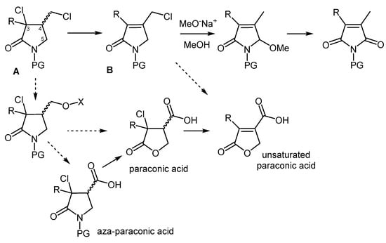The numerous functional groups within the backbone of dichloro-γ-lactams readily explain their extensive synthetic flexibility. An example of this is the well-known elimination/substitution sequence (solid arrow in the upper Figure 2), which provides access to maleimides or their related hydrolysis products, i.e., maleic anhydrides [13]. The notable acidity of the hydrogen atom in position 4 of these structures (A, Figure 2) make them highly susceptible to first undergo elimination of hydrogen halide, a feature that was exploited for the preparation of unsaturated pyrrolidin-2-ones (B) [14].
