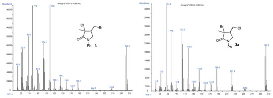 When a moderate amount of NaBr (0.25 mol for each mol of 1) was included into the described ARGET-ATRC reaction mixture, a new product was formed, together with the standard product 2. This new compound, which exhibited higher retention in GC-MS (r.t. ~13.95 min) compared to 2 (GC r.t. ~12.90 min), was characterized by a MS pattern compatible with a bromochlorolactam. Further characterization through multinuclear NMR spectroscopy, after careful chromatographic fractionation, confirmed the identity of compound 3. The limited effectiveness of the radical substitution mechanisms that produce 3a or 3b under AERC conditions was then confirmed. This was further confirmed by heating a purified sample of compound 2 at 50 °C for 24 h in the presence of 10 mol% of the Cu(II)Br2·TPMA metal complex. Under these conditions, 2 converted to another compound, characterized by a molecular ion very near to that of lactam 3 but showing a different GC retention time (~13.85 min) and mass fragmentation (Figure 4). It was thus assigned to 3a.
