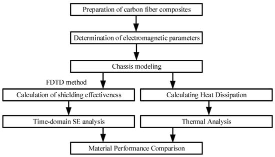 First, the nickel-plated carbon fiber composite is prepared, which was initially under-taken through an electroless deposition process. Following this, the essential task of calculating the SE involved the meticulous measurement of the complex permittivity and magnetic permeability. These critical electromagnetic parameters were accurately determined using a vector network analyzer, ensuring the reliability of the subsequent analyses. Subsequently, the architecture of the composite chassis was modeled to facilitate a comprehensive examination of electromagnetic field distributions within the structure. This modeling enabled the precise identification of field values at strategically placed observation points inside the chassis, achieved through the application of 3D-FDTD iterative calculations. The utilization of the FDTD method allowed for the extraction of time-domain SE metrics, providing a nuanced understanding of the chassis’s shielding capabilities. Expanding upon this foundation, the study delved deeper into the nuanced analysis of the composite chassis’s time-domain SE under a variety of test conditions. These conditions encompassed differing angles of incidence and polarization, alongside a spectrum of polarization modes, thereby offering a robust evaluation of the chassis’s performance across diverse electromagnetic scenarios. Each scenario was meticulously designed to mimic realistic operational environments, thus ensuring the applicability of the findings. Finally, COMSOL software was used to analyze the heat dissipation rates of metal chassis, carbon fiber chassis, and composite chassis to fully evaluate the comprehensive performance of the shielding chassis proposed in this paper. Illustrative of the methodological approach, Figure 1 encapsulates the flow of the study, delineating each step from the preparation of the composites to the final analysis of time-domain SE.