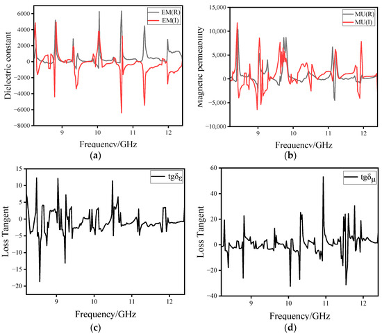 The electromagnetic parameters of the nickel-plated carbon fiber in the X-band are shown in Figure 5, where Figure 5a shows the complex permittivity of the nickel-plated carbon fiber, Figure 5b shows the complex permeability, Figure 5c shows the tangent of the dielectric loss angle, and Figure 5d shows the tangent of the magnetic loss angle. EM(R) and EM(I) are the real and imaginary parts of the complex dielectric constant, and MU(R) and MU(I) are the real and imaginary parts of the complex permeability, respectively.