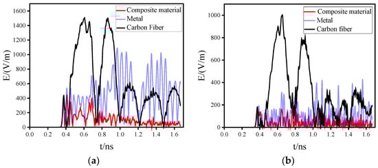 The results show that the electric fields at the observation points are different for all three materials under different polarization modes. It can be seen that the peak electric field at the observation point in the carbon fiber chassis is the highest and the TDSE is the lowest, regardless of vertical or horizontal polarization. The peak electric field of the metal chassis is smaller than that of the carbon fiber chassis and larger than that of the nickel-plated carbon fiber chassis. This is because when electromagnetic waves are coupled into the chassis, the high conductivity of the stainless steel generates a strong impedance mismatch with the air, resulting in strong reflected waves. For nickel-plated carbon fiber chassis, the high conductivity of the outermost layer of nickel can effectively reflect electromagnetic waves. At the same time, from the inside of the chassis to the outside of the formation of an “air–carbon fiber–nickel” structure, this conductivity gradient increases the asymmetric structure and can effectively improve the impedance mismatch problem to alleviate the reflection of electromagnetic waves inside the chassis. Finally, the nickel-plated layer has good magnetic properties, which can further absorb the electromagnetic wave reflected to the nickel-plated layer inside the chassis. Thus, the peak electric field inside the chassis decreases significantly. Therefore, the nickel-plated carbon fiber chassis has the highest time-domain shielding effectiveness.
