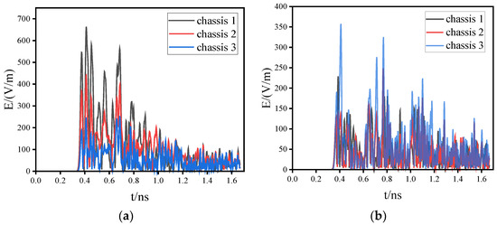 Electric field at the observation point of different structural chassis: (a) horizontal polarization; (b) vertical polarization.
