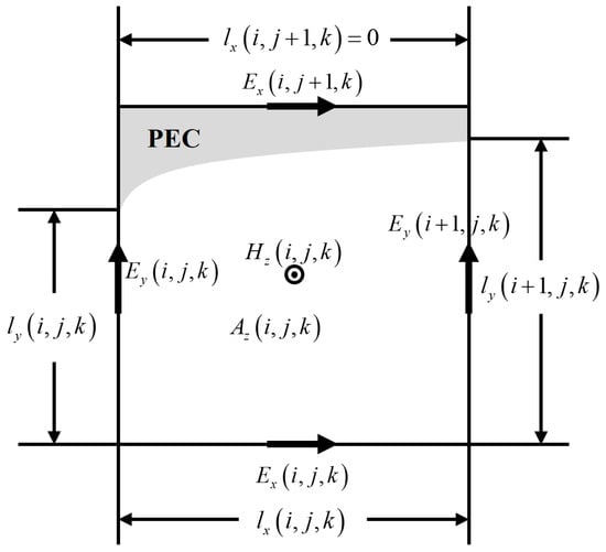 As shown in Figure 1, conformal grids are applied at the curved surface boundary of the object, where and represent the grid cell dimensions, excluding the perfect electric conductor (PEC) parts, and denotes the grid cell area, excluding the PEC parts. The spatial distribution of the electromagnetic field components is consistent with the conventional Yee grid.