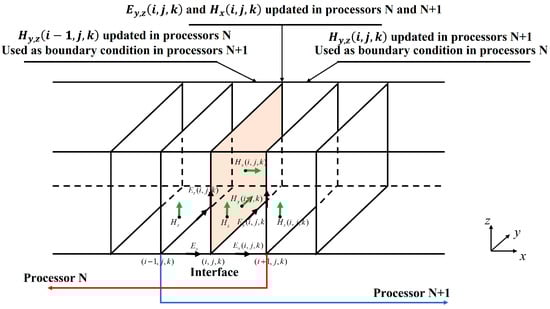 Suppose the subdomains are arranged along one direction for brevity, with the x-direction being the example in this paper. As shown in Figure 2, the orange-colored face with the grid index represent the interfaces between subdomains. A layer of virtual grid cells is used to facilitate the information exchange between the two subdomains. These virtual grid cells contain field information from adjacent subdomains. For instance, the virtual grid cell index in process N (marked by red lines) is , while in process N + 1 (marked by blue lines), it is .The electric field components and magnetic field components at the interface are overlapping field components from two adjacent subdomains, and they need to be updated in both processes N and N + 1. The magnetic field component updated in process N will be passed to process N + 1 to update the electric field component at the interface. Similarly, the magnetic field component updated in process N + 1 will be passed to process N to update the electric field component at the interface.