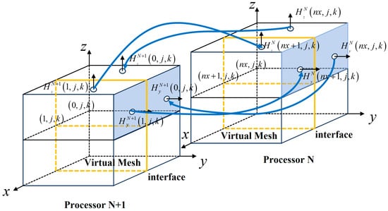 Figure 3 depicts a three-dimensional schematic of the exchange of electromagnetic fields between adjacent subdomains. The orange markings denote the interface between the subdomains. The virtual mesh indices in processes N and N + 1 are and , respectively, which are used to store the magnetic field and conformal grid information from adjacent subdomains. It is only necessary to exchange the magnetic fields and at the interface between the two neighboring subdomains. The subdomains are interrupted only once in each iterative step.