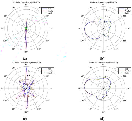 As shown in Figure 6a–d, the far-field patterns of the unmanned helicopter and the helical antenna, respectively, show complete consistency between serial and parallel results, and are basically consistent with the CST results, indicating the correctness of the parallel algorithm results.