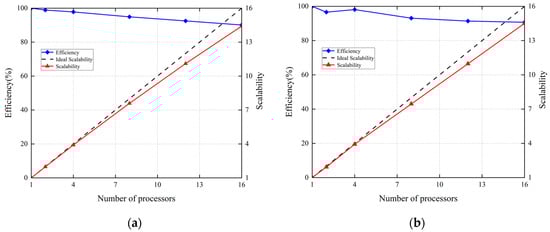 Tests were conducted on the supercomputing platform, with processors counts set to 1, 2, 4, 8, 12, and 16. Specific test data are provided in Table 1, and the scalability and efficiency are illustrated in Figure 7a,b. It can be observed that the parallel efficiency of both cases is above 90%, and the scalability approaches linearity. These test results demonstrate that the non-uniform conformal parallel FDTD algorithm performs well with a small number of processors on a single node, and it also presents excellent acceleration effects for CPML absorbing-boundary layers.
