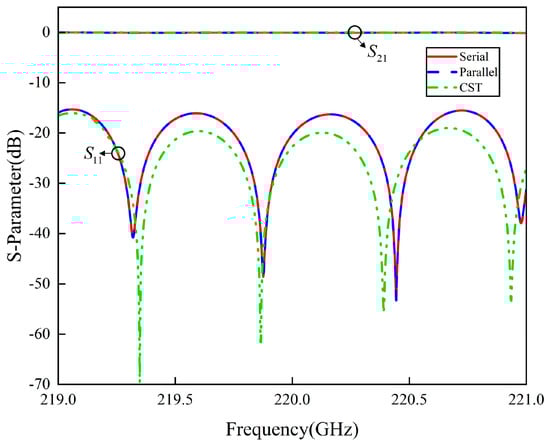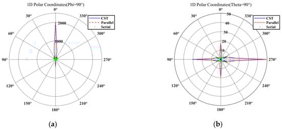 Figure 9 shows the S-parameter results of the folded waveguide, where S11 is completely below −15 dB and S21 is completely within −0.12 dB. Both our algorithm and CST show good transmission characteristics. Figure 10a,b depict the far-field patterns for the antenna array. The serial and parallel results are entirely consistent, and basically consistent with the CST results, also indicating the correctness of the parallel algorithm results.