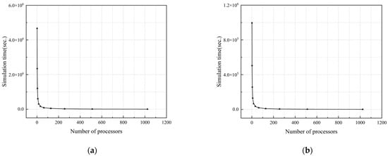 On the supercomputing platform, the parallel non-uniform conformal FDTD algorithm was executed with different numbers of processors ranging from 1 to 1024. The number of processors for domain decomposition was selected from 1 to 1024, including 1, 2, 4, 8, 16, 32, 64, 128, 256, 512, and 1024. Multi-node parallelism started with 64 processors, and 1024 processors were run on 33 nodes. The specific test data are provided in Table 2. From Figure 11, it can be observed that the computational time for both cases decreased significantly from 4,672,834 s and 996,042 s for single processors to 6264.5 s and 1316.3 s for 1024 processors, respectively, resulting in a substantial reduction in computation time.