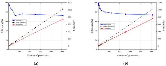 (a) The parallel scalability and efficiency of the 100-period folded waveguide on a multi-node; (b) the parallel scalability and efficiency of the 16 × 16 phased array antenna on a multi-node.