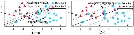 As shown in Figure 1, the SVM model generates a hyperplane to separate data points with the objective of balancing the preservation of a wide margin and the minimization of errors. The width of this margin is controlled by the hyperparameter C. When C is larger, as depicted in the left graph, the error rate decreases while the margin narrows, ultimately diminishing the model’s ability to generalize to new data. On the other hand, a smaller value of C, as seen in the right graph, yields a wider margin, enhancing the model’s capability to generalize to unseen data [].