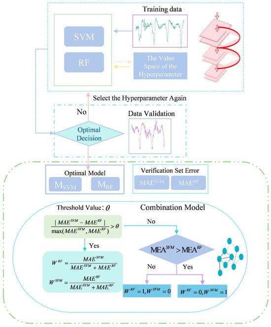 In Equations (5)–(8), where is the calculated value, is the real value of the SVM model, is the RF model on the validation set, and represent the calculation error of the model, and and represent the combined weight.