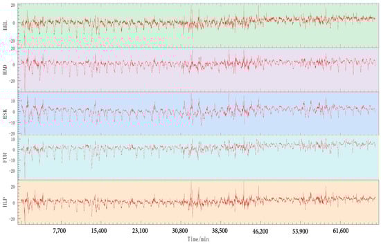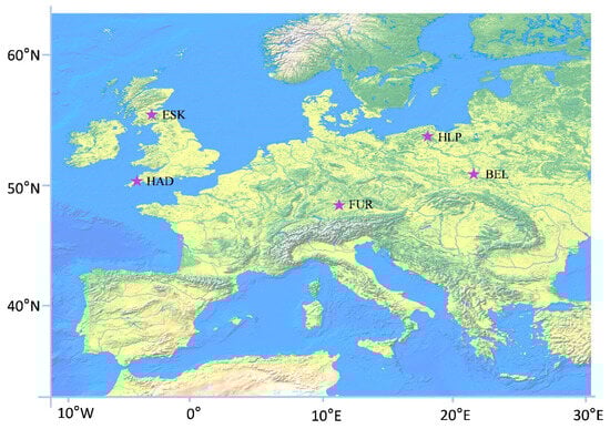 For the experimental analysis in this study, data from five geomagnetic stations in the European region—BEL, ESK, FUR, HAD, and HLP—between 10 November and 27 December 2018 were sourced from the INTERMAGNET website. The daily variation data from these selected stations were utilized. The geographical distribution of these stations is illustrated in Figure 4.