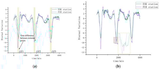 The daily variation observation data from the ESK and FUR stations in Europe for the period of 15 to 17 November 2018 are depicted in Figure 5. Equation (6) is applied to calculate the time difference correction value using three selected time windows for adjustment. Figure 5a illustrates the sample data without time difference correction, while Figure 5b displays the data after extreme value adjustment correction. The main station is designated as station A, and station B is selected for time difference correction. After computation, the time differences between the two local regional extreme values are found to be , , and . The mean value of these time differences is then utilized as the time difference correction value for station B. The corrected image is displayed on the right, and the Pearson correlation coefficient is determined to be 0.93.