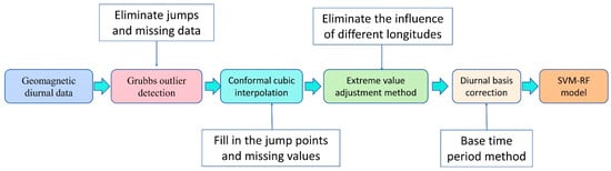 In order to ensure the integrity of the experiment and mitigate the impact of outliers and missing data in the geomagnetic station dataset, the Grubbs outlier detection method is first employed for detection and removal. Jump points and missing values are subsequently addressed through conformal cubic interpolation. When applying the SVM-RF model for estimating daily variations, a specific geomagnetic station is selected as the main station, with the remaining stations utilized as training stations for model training.