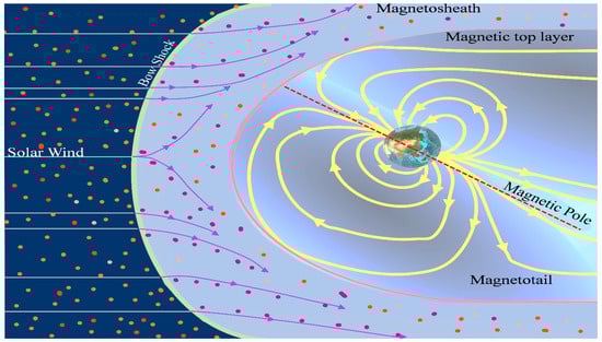 As depicted in Figure 9, the Earth is impacted by a significant influx of high-energy particles generated by solar activity. Owing to the presence of the Earth’s magnetic field, the trajectories of these particles are bent and diverted away from the Earth []. The particles interacting with the Earth’s magnetic field cause short-term effects. Solar activity’s complexity and irregularity lead to the intricate and variable diurnal variations in the geomagnetic field.