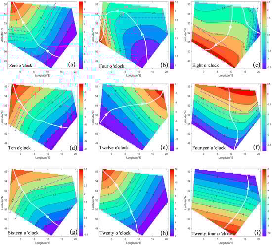 Figure 10 provides a visual representation of the geomagnetic diurnal variation model across a localized area in Europe on 10 November 2018, at nine specific time points. The white line in the figure corresponds to the prevailing trend line at that particular moment, while the dotted line illustrates the vertical gradient shift within the area under consideration. The complex and variable nature of the alteration trends throughout the day is evident in Figure 10. These fluctuations typically manifest along either the latitude or the longitude axis, although no consistent pattern emerges. Moreover, there is a noticeable inclination between the latitude and longitude directions at various time points. For example, in Figure 10a, the gradient shift is observed toward the northwest. By 8 o’clock (Figure 10c), the gradient predominantly shifts to the northeast, with a minor segment on the right side indicating a northwestward trend, suggesting a gradual evolution in the gradient’s orientation. At noon (Figure 10d), there is a shift in the gradient direction toward the northwest, followed by a transition to the northeast between 12 o’clock and 14 o’clock. Subsequently, from 16:00 to 20:00, the gradient direction reverts back to the northwest before changing again to the northeast by midnight. This continuous shifting of the geomagnetic diurnal variation pattern over the course of a day underscores a nonlinear trend that deviates from a strictly latitude- or longitude-based orientation.