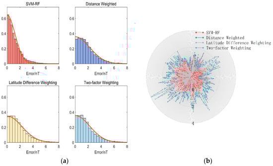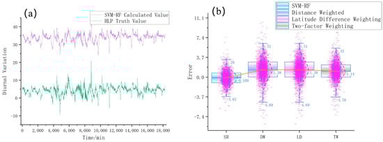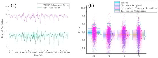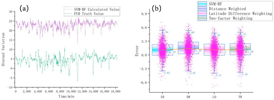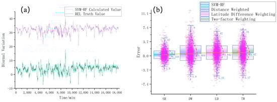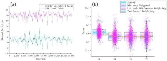 As depicted in Figure 16, the radar map in (b) illustrates the error distributions of various models, whereas (a) shows the distribution of absolute errors for each daily variation prediction model. The SVM-RF daily variation prediction model introduced in this study demonstrates smaller absolute errors, primarily concentrated toward the lower end of the scale. Specifically, the error distribution of the SVM-RF model is centered within the inner regions of all models, suggesting superior calculation performance and accuracy.